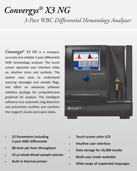 6. Kết Luận: Convergys® X3 NG không chỉ là một máy phân tích huyết học thông thường mà còn là một đối tác đáng tin cậy trong việc chăm sóc sức khỏe. Với những tính năng và lợi ích vượt trội, sản phẩm này đem lại sự tiện lợi và chính xác cho ngành y tế, góp phần nâng cao chất lượng cuộc sống và sức khỏe của cộng đồng.